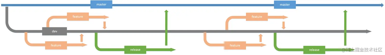 以上规范适用于大型项目且人员较多的情况,为了避免分支命名、合并、代码拉取等不规范操作导致代码错乱的问题,所以代码分支规范设定得较为复杂。若项目处于初期,并且开发人员较少,也可以采用下图中的方式来管理: