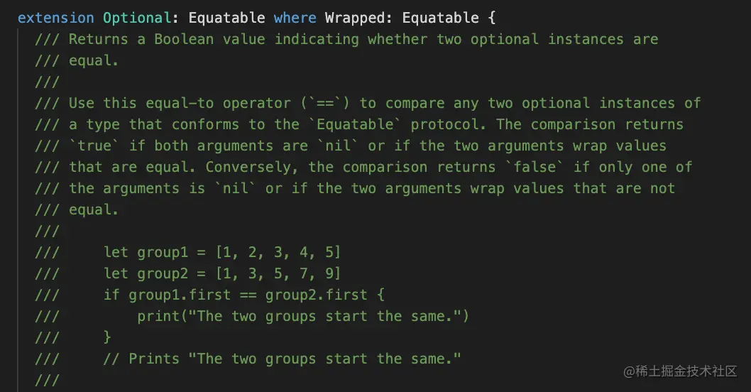 通过遵循Equatable协议来判断两者之间是否相等