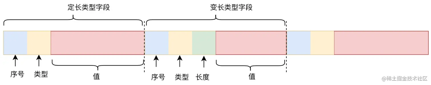 为方便阐述,先概述下Protobuf编码格式。如下图所示,Protobuf按“键-值”形式序列化每个属性,其中键标识了该属性的序号和类型。可以看出,从原理上,序列化主要要依赖键中定义的字段序号和类型。