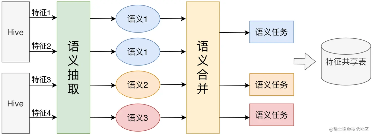 特征平台对特征语义的处理分为两个阶段:语义抽取和语义合并,如下图所示: