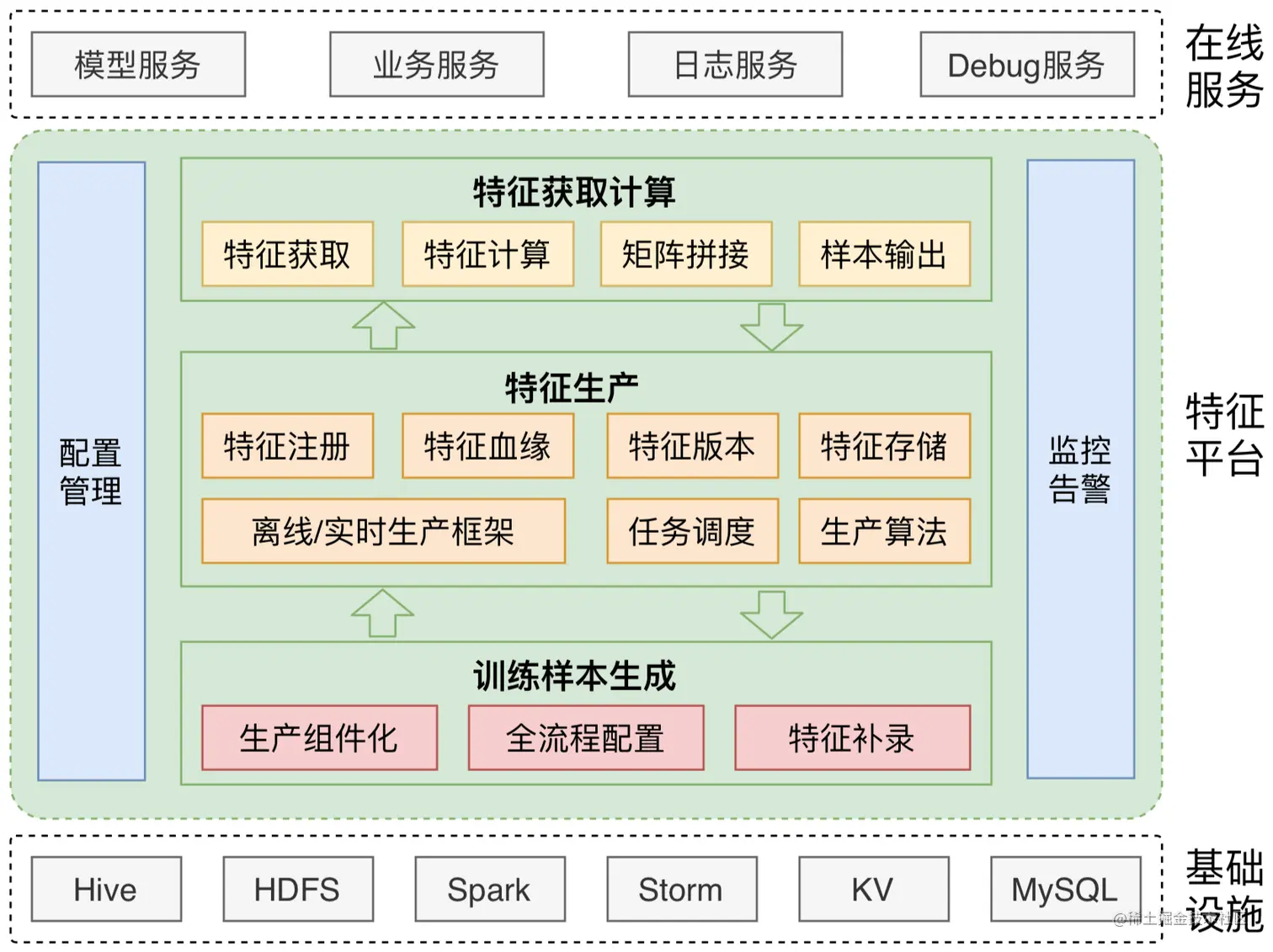 特征平台框架由三部分组成:训练样本生成(离线)、特征生产(近线)以及特征获取计算(在线),如下图所示: