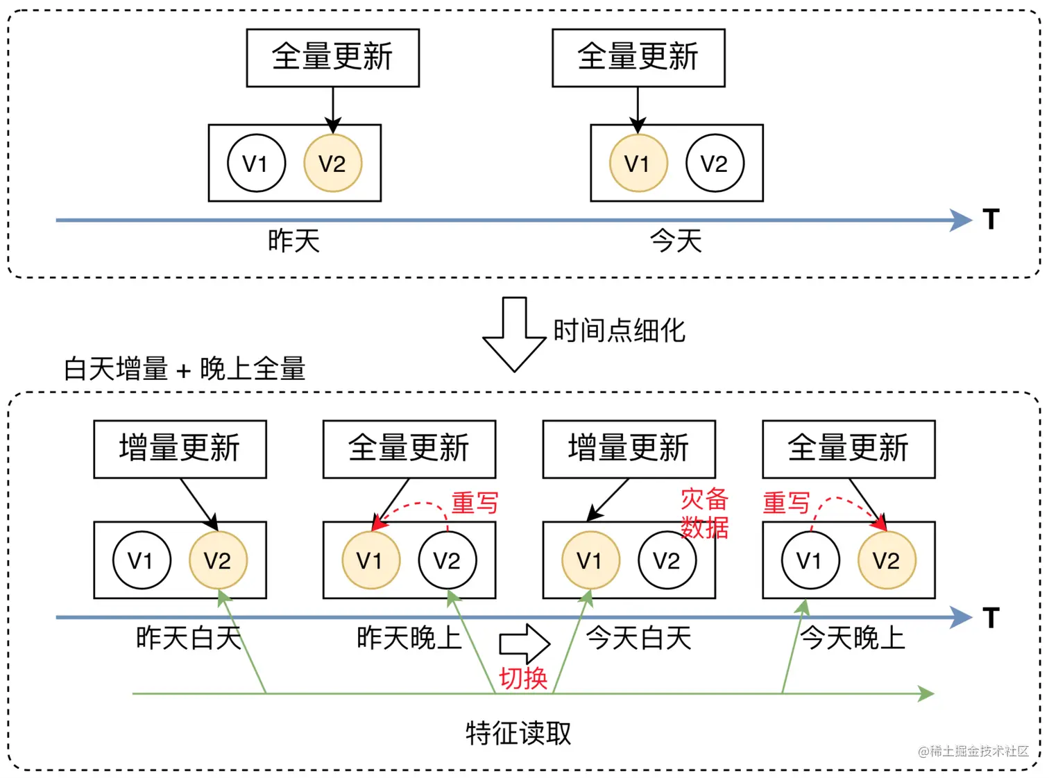 传统的多版本方式是通过全量数据的切换实现,即每天在全量数据写入后再进行版本切换。然而,特征平台存在增量和全量两种更新方式,不能简单复用全量的切换方式,需考虑增量和全量的依赖关系。因此,特征平台设计了一种适用于增量&全量两种更新方式下的版本切换方式(如下图所示)。该方式以全量数据为基础,白天进行增量更新,版本保持不变,在增量更新结束后,定期进行全量更新(重写),并进行版本切换。