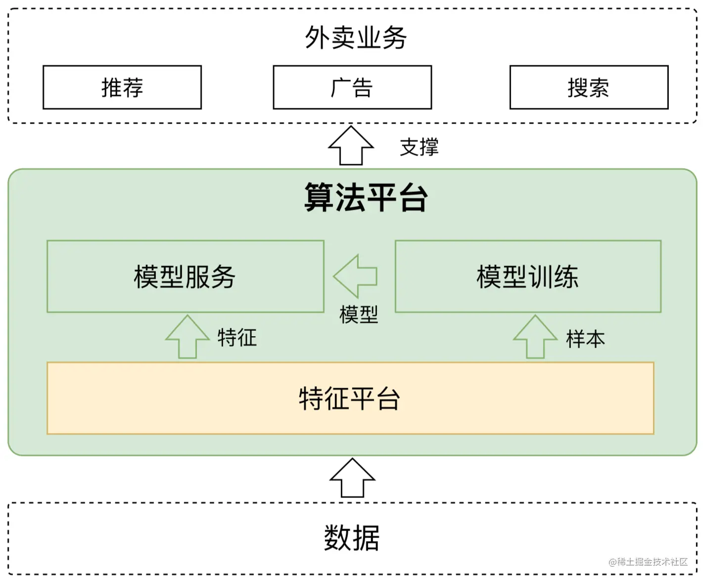 随着业务的发展,外卖算法模型也在不断演进迭代中。从之前简单的线性模型、树模型,到现在复杂的深度学习模型,预估效果也变得愈发精准。这一切除了受益于模型参数的不断调优,也受益于外卖算法平台对算力增长的工程化支撑。外卖算法平台通过统一算法工程框架,解决了模型&特征迭代的系统性问题,极大地提升了外卖算法的迭代效率。根据功能不同,外卖算法平台可划分为三部分:模型服务、模型训练和特征平台。其中,模型服务用于提供在线模型预估,模型训练用于提供模型的训练产出,特征平台则提供特征和样本的数据支撑。本文将重点阐述外卖特征平台在建设过程中遇到的挑战以及优化思路。