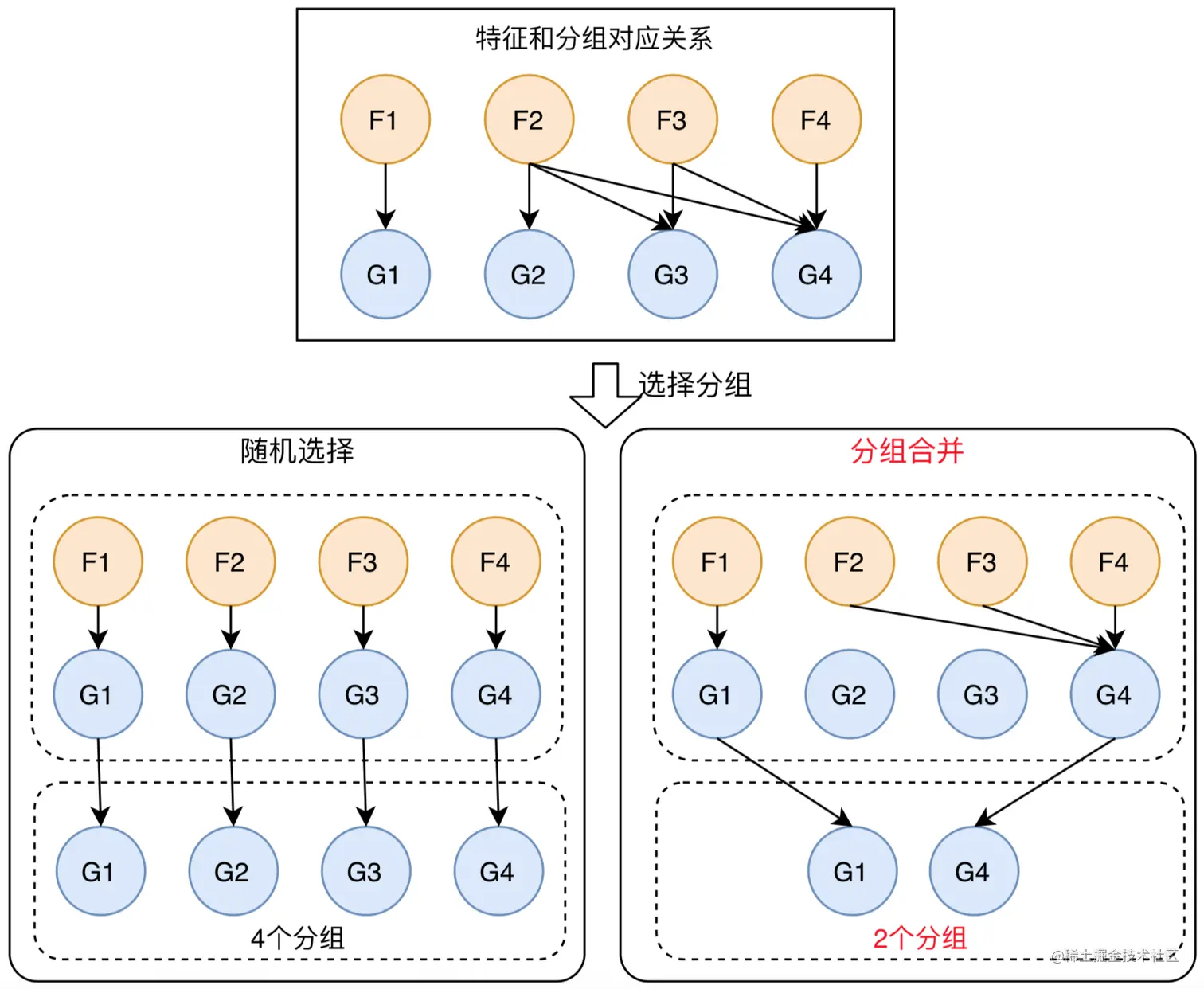 智能分组可以有效的提升特征获取效率,但同时也引入了一个问题:在智能分组过程中,特征在分组迁移阶段,会出现一个特征同时存在于多个分组的情况,造成特征在多个分组重复获取的问题,增加对KV存储的访问压力。为了优化特征获取效率,在特征获取之前需要对特征分组进行合并,将特征尽量放在同一个分组中进行获取,从而减少访问KV存储的次数,提升特征获取性能。