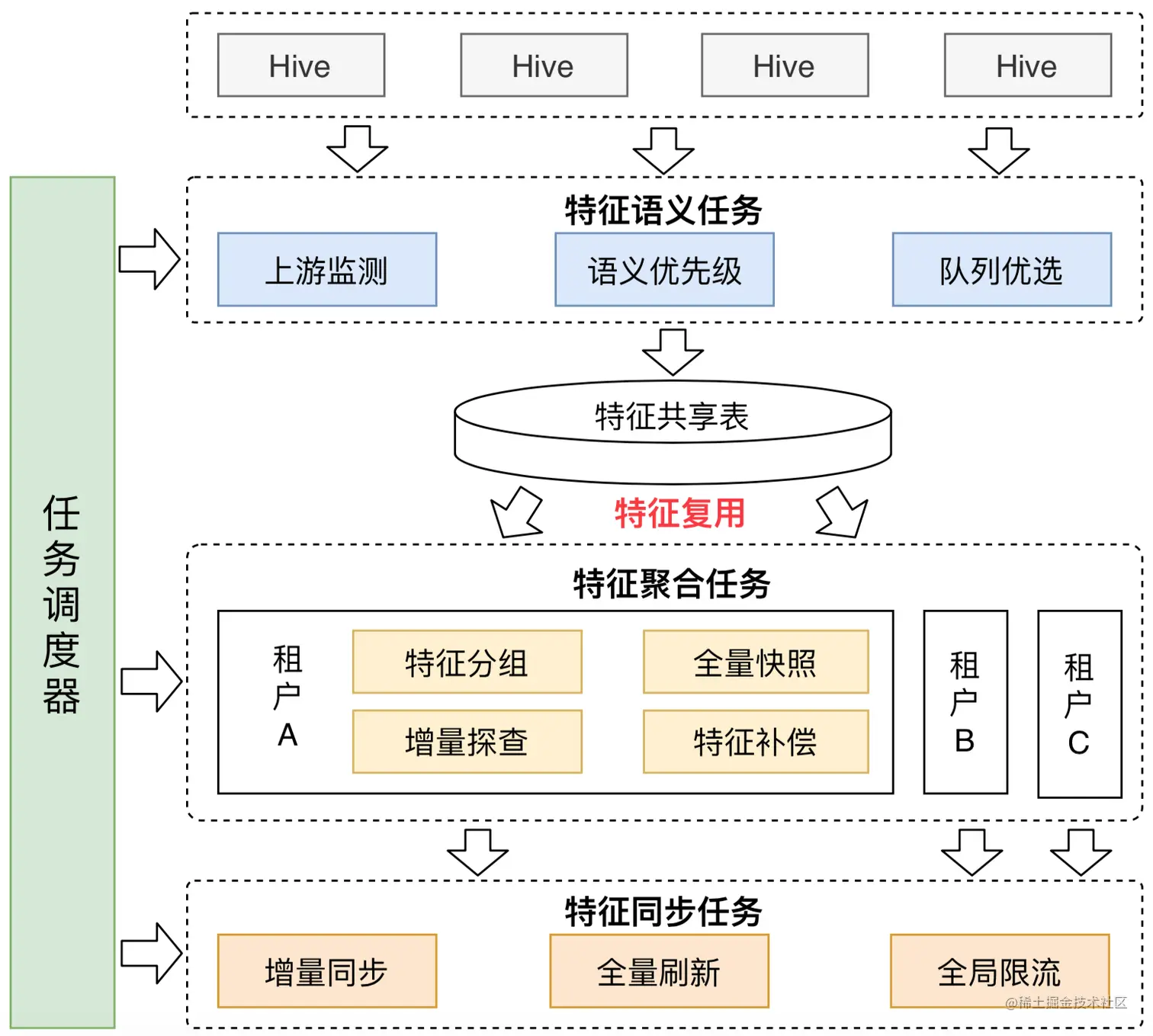 - 特征聚合任务:用于不同业务线(租户)按照自身需求,从特征共享表中获取特定特征并聚合,生成全量快照以及增量数据。