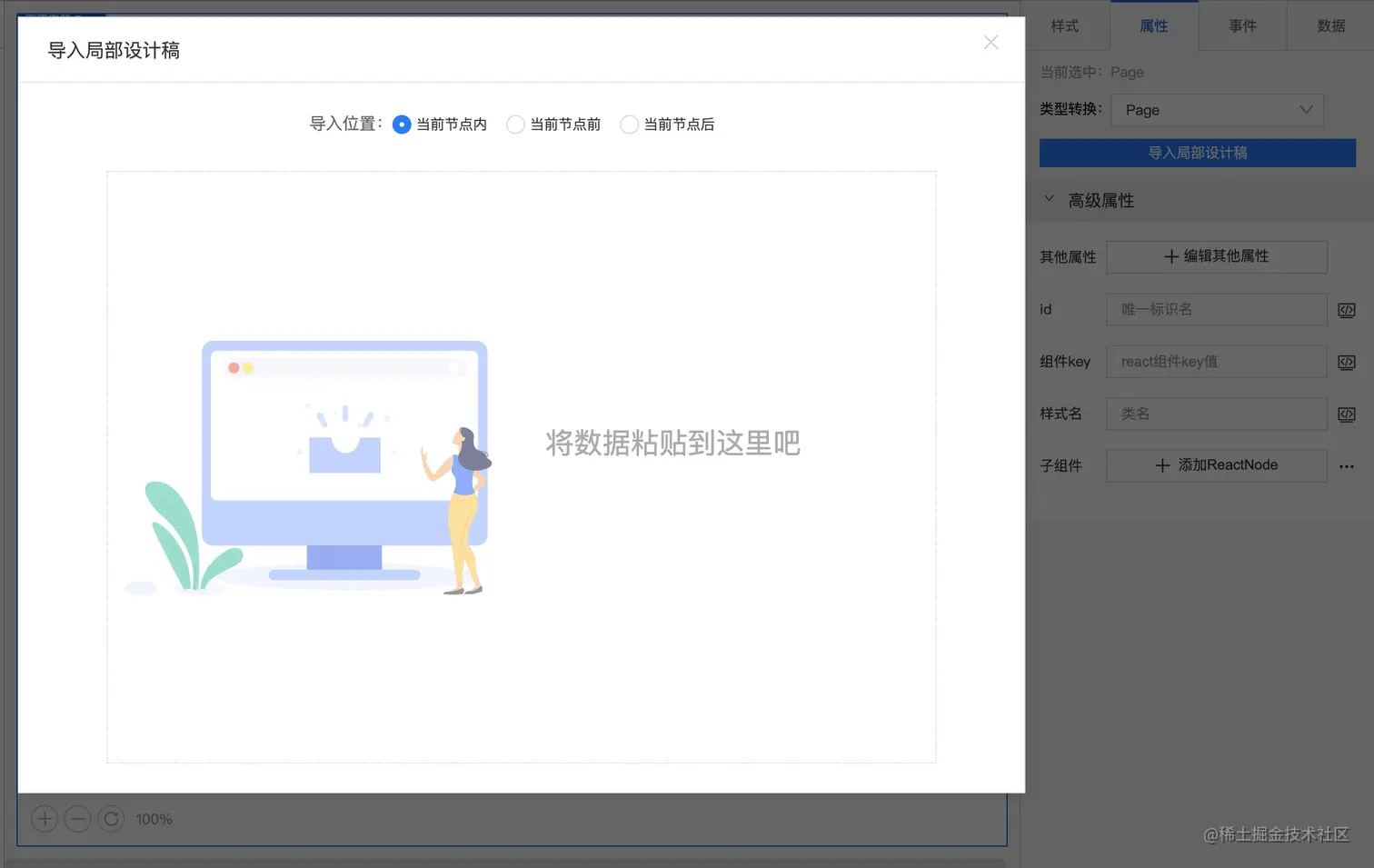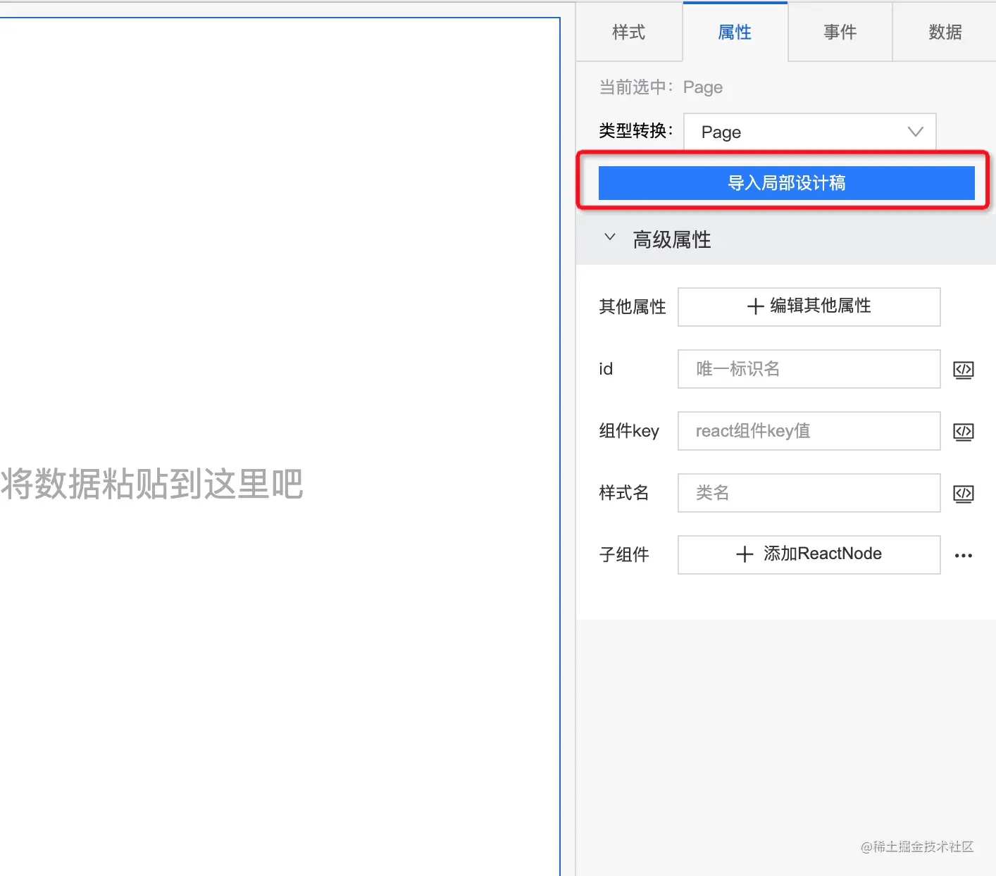 在编辑器右侧的属性面板中,新增了导入局部设计稿入口