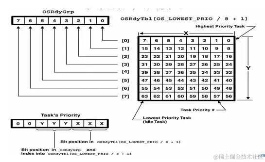 TaskPrior = 8*i+j=(i<<3)+ j;//找到最高优先级号。
