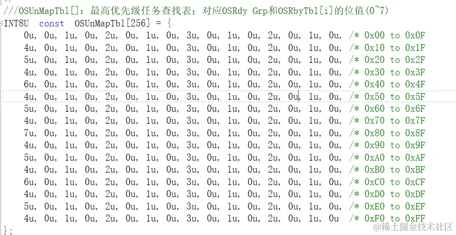 2.在OSUnMapTbl表中找到第OSRdyTbl[i] 位对应的数字,该数字赋值给j,代表优先级所在的列号;