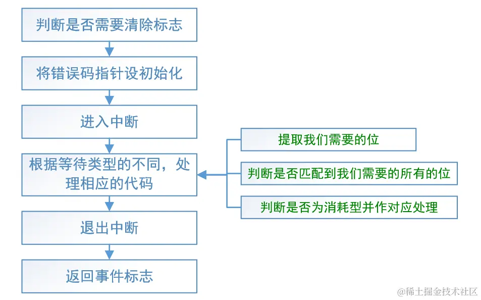*注释:如果需要在得到期望的事件标志后,清除该事件标志,则可以在调用函数时,