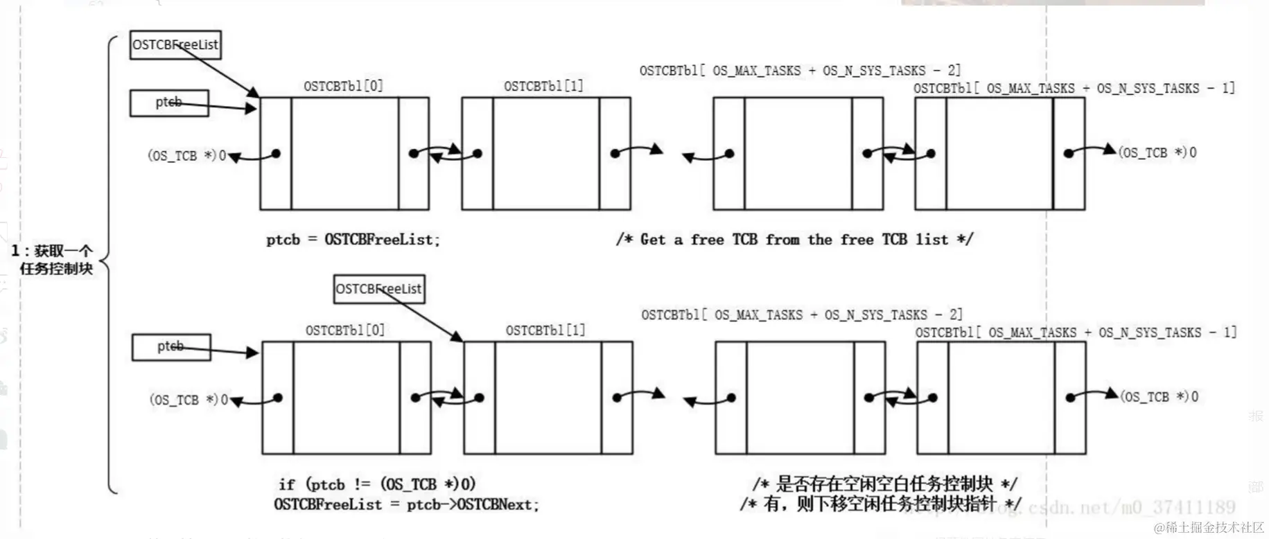 ptcb = OSTCBFreeList; /*ptcb指针指向空闲TCB列表,来获得一个空闲的TCB*/