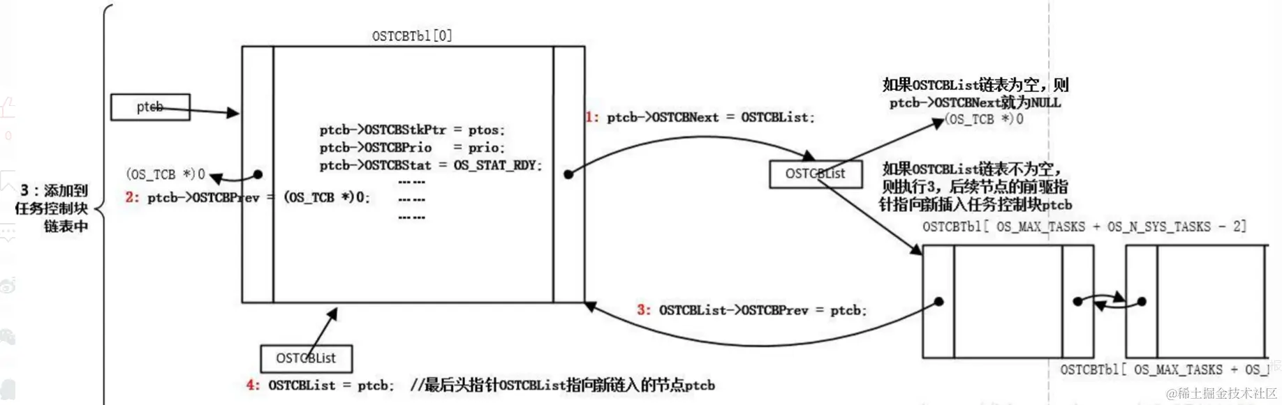 ptcb->OSTCBNext = OSTCBList; /* Link into TCB chain链接到任务控制块链接串*/