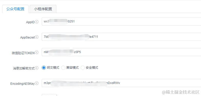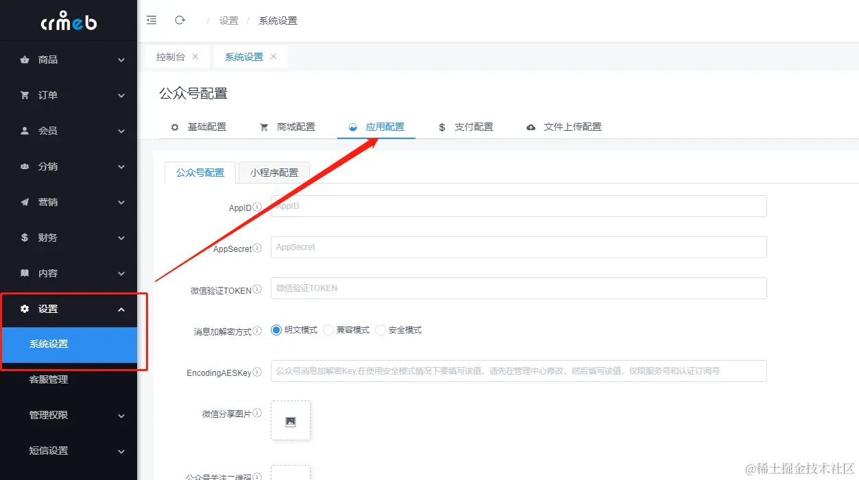 14.复制token和EncodingAESKey,在crmeb管理后台在设置->系统设置→应用配置里对应的位置 点击下方 【提交】按钮保存配置信息