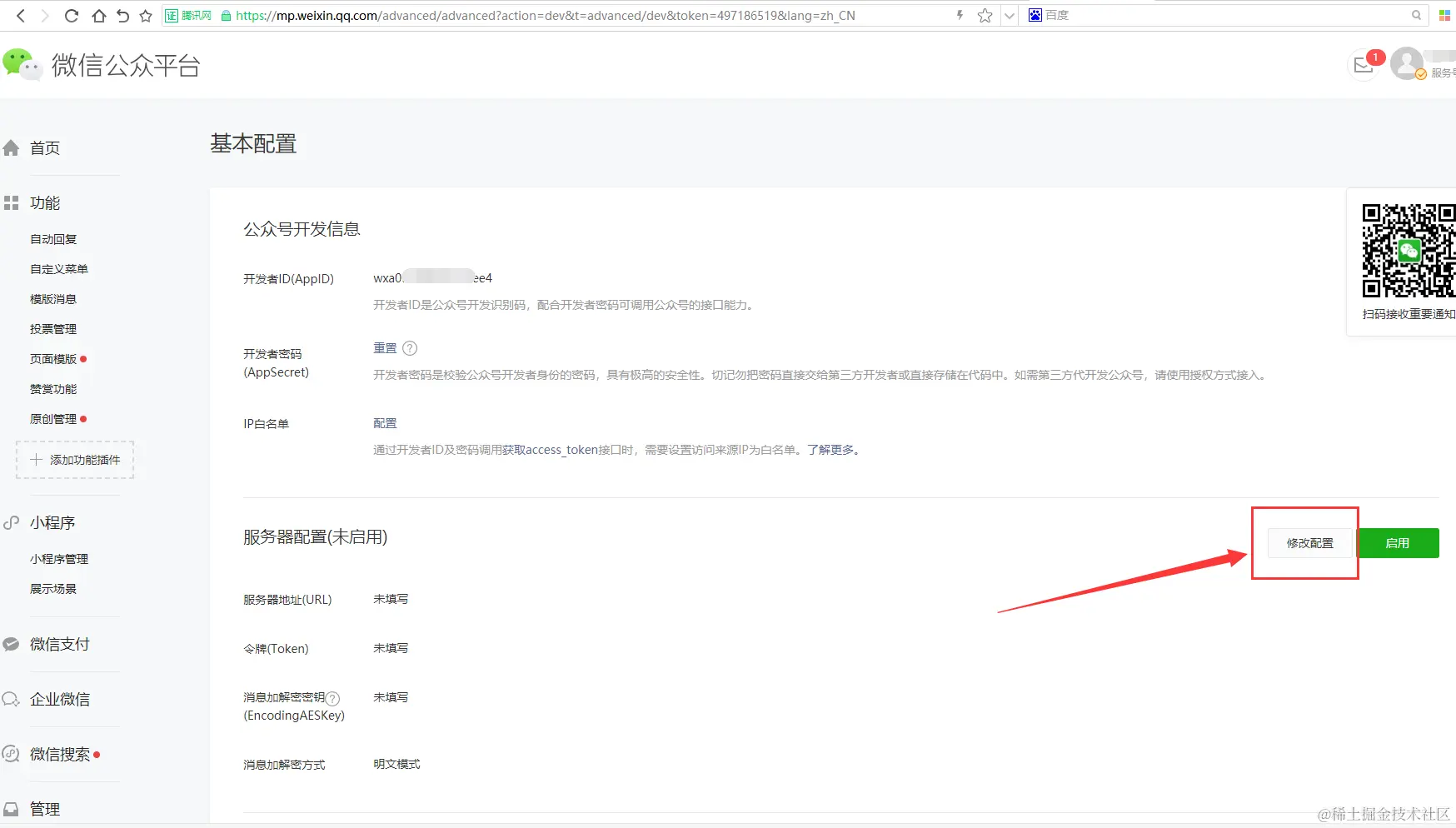 10.微信公众平台->服务器配置,首先进入微信公众平台点击基础设置 找到 [修改配置] 按钮