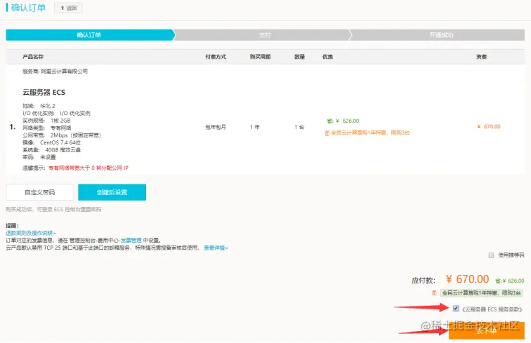 2.确定服务器参数,确定无误后勾选右下角“《云服务ECS服务条款》”,点击去下单。