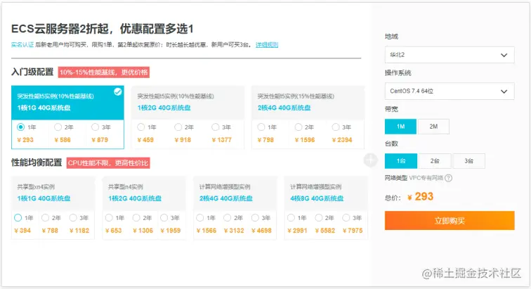 左侧为服务器配置选择,服务器配置根据项目用户量自行选择。地域推荐选择你程序项目运营城市所属地域,操作系统“CentOS”即可。带宽、台数根据你自行选择。确定好后点击右下角立即购买。