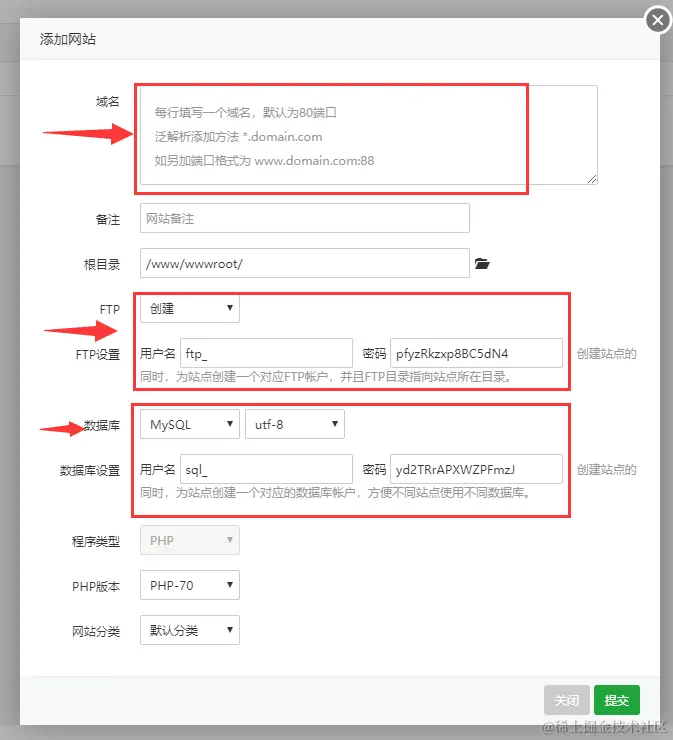 3.输入你要绑定的网站域名(上一步中域名配置所解析的域名),创建FTP,创建MySQL数据库。都填写后,点击提交