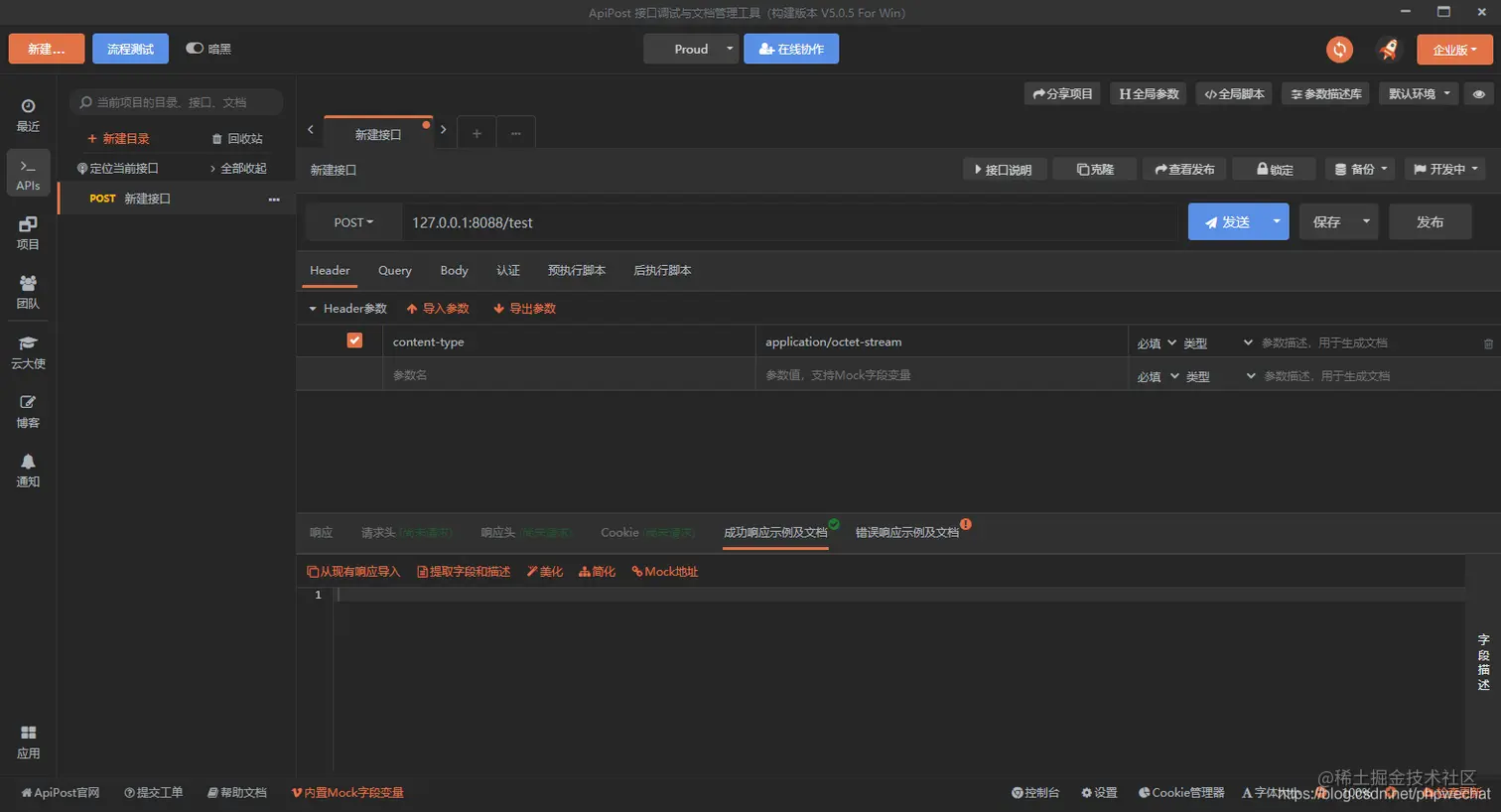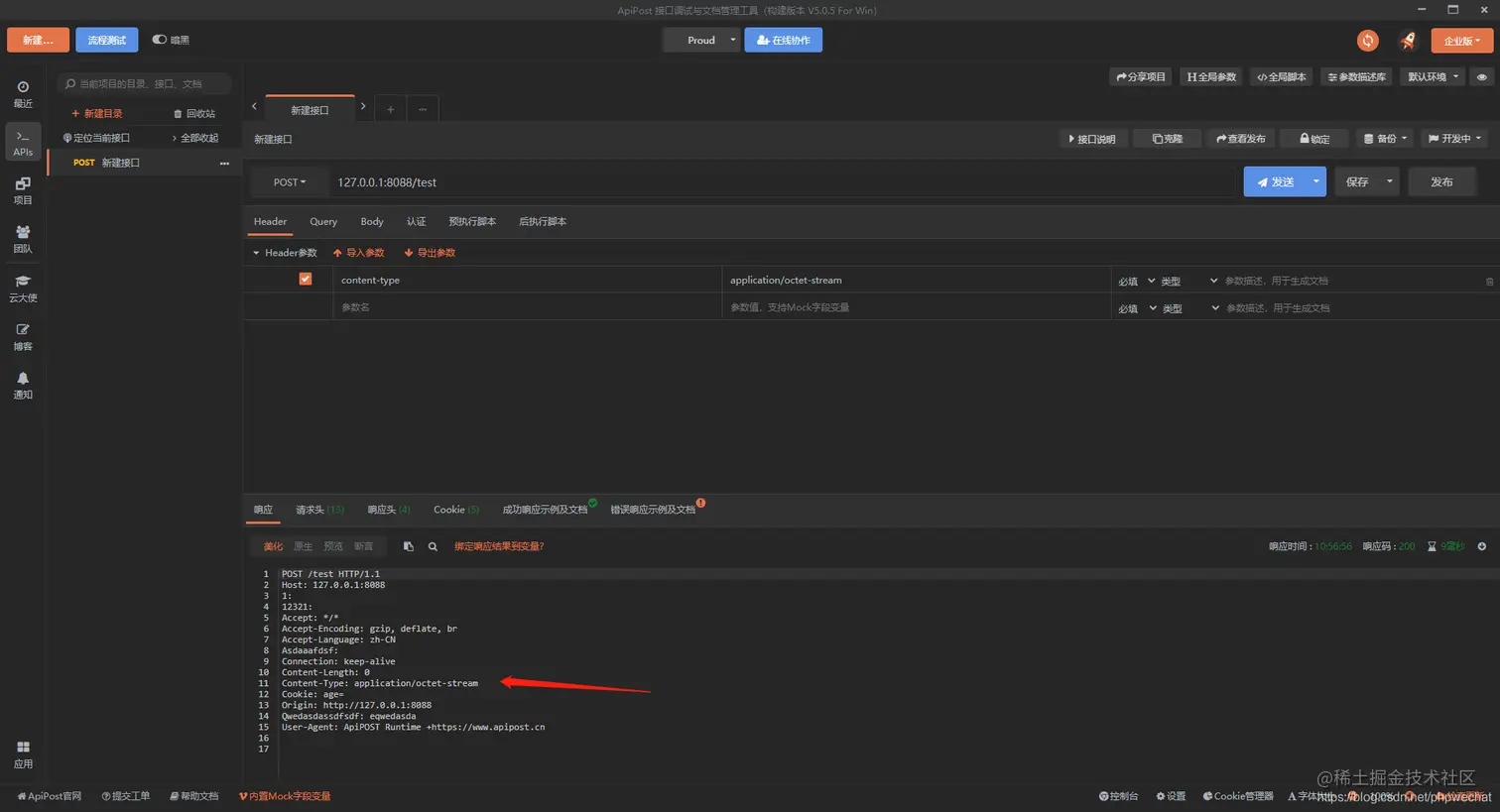 然后body选择的为form-data,然后什么body中什么都不填写,点击发送,发送的content-type的格式是为自定义的application/octet-stream。