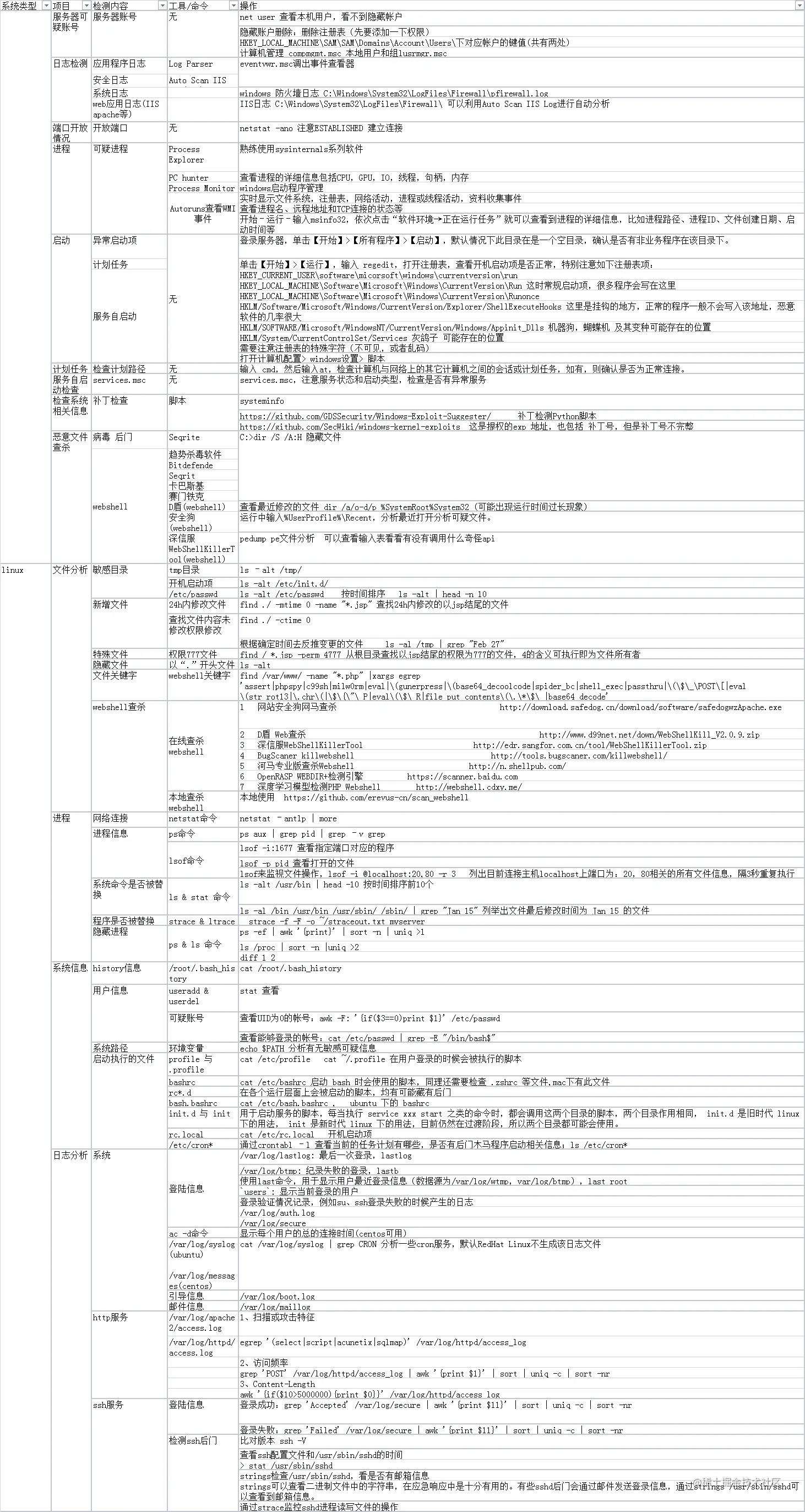 | | 文件关键字 | webshell关键字 | find /var/www/ -name "*.php" | xargs egrep 'assert | phpspy | c99sh | milw0rm | eval | (gunerpress | (base64_decoolcode | spider_bc | shell_exec | passthru | ($_\POST[ | eval (str_rot13 | .chr( | ${"_P | eval($_R | file_put_contents(.*$_ | base64_decode' |