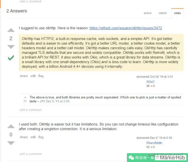 这又触及到我的知识盲区了,首先来一波面向百度学习,直接根据关键字 httpclient 和 okhttp 的区别、性能比较进行搜索,没有找到想要的答案,于是就去 overstackflow 上看看是不是有人问过这个问题,果然不会让你失望的