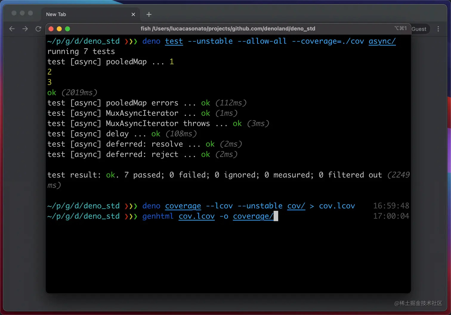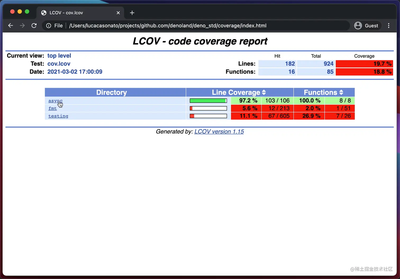 几天来,我们一直在 deno_std 上对该功能进行测试。我们将每次提交的覆盖率报告同步上传到 codecov.io 上。你可以在这里查看相关内容:codecov.io/gh/denoland…。添加这个功能并不难,在 Github Actions 工作流上仅进行了如下 10 行的更改: