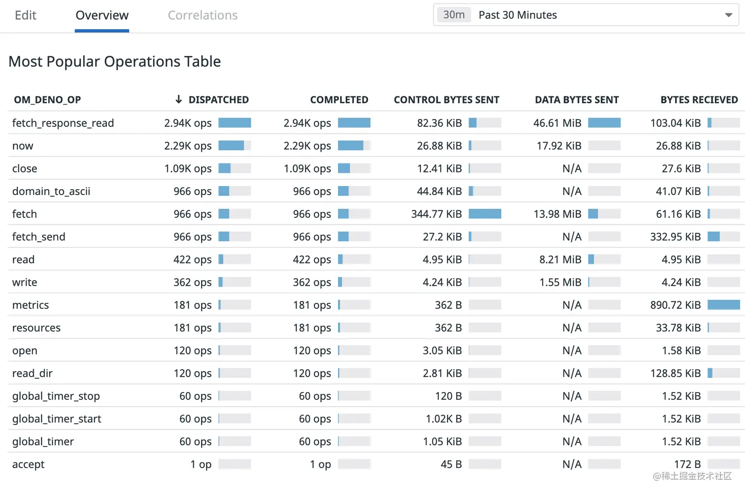 与 --unstable 一起运行时,此版本向 Deno.metrics 添加了一个名为 ops 的新字段。此字段包含每个操作的信息,这些信息涉及 API 的调用频率以及通过 API 传输的数据量。这允许对运行时进行更精细的检测。