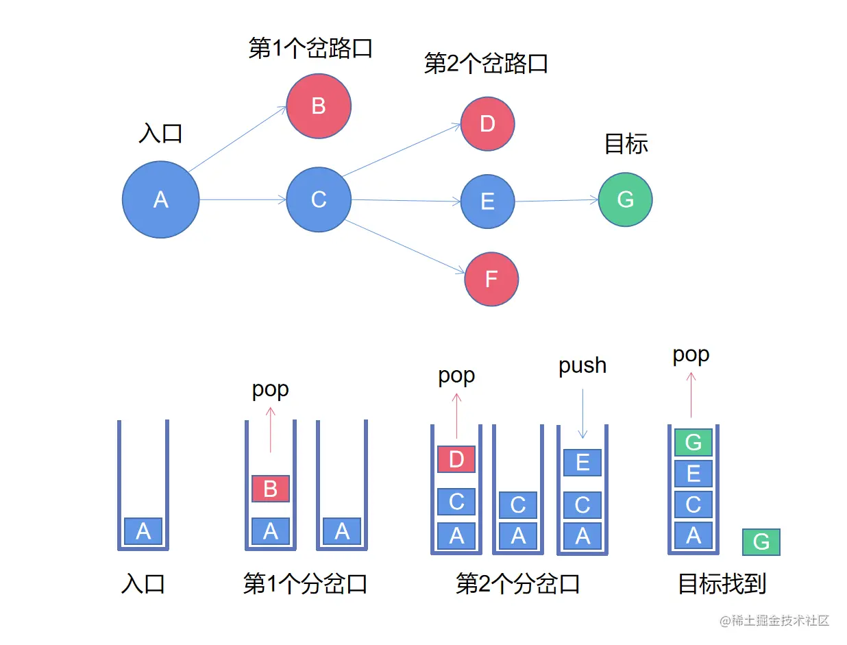 DFS算法的思路,是试图穷举全部路径。 遍历的目标时,一个劲的往下走,直至无路可走,这大概是深度优先算法中“深”的由来吧!这种思路跟堆栈的数据结构契合。例如上面的例子,用堆栈的方式可以表示如下: