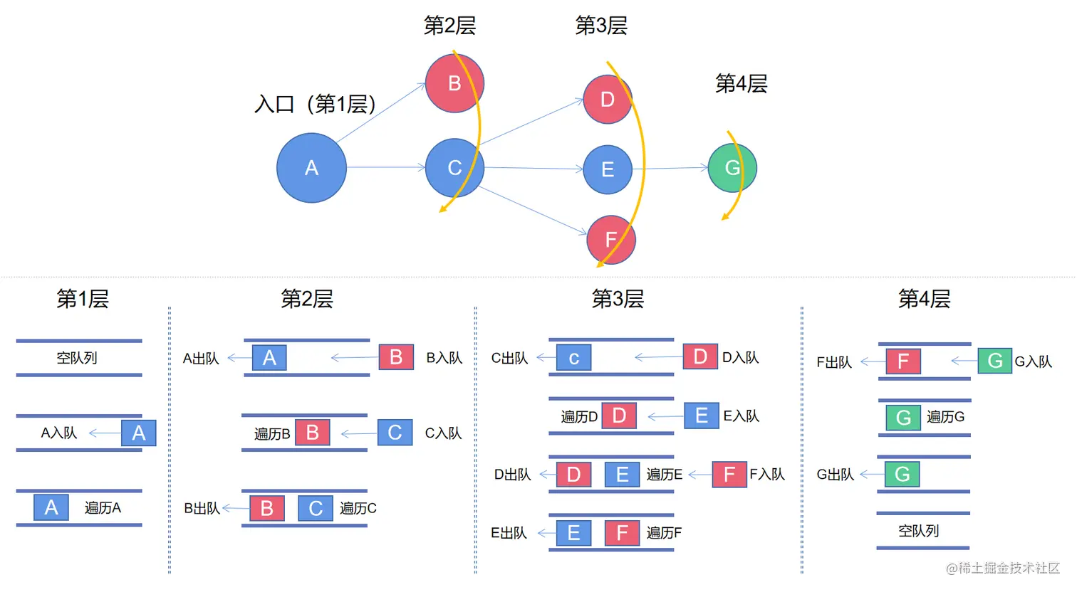 BFS算法的思路,是逐层遍历,遍历到哪个层,就把该层的所有数据都遍历完,才考虑下一层。注重的是广度优先,这大概是广度优先算法中“广”的由来吧!这种思路的实现需要用到队列这种数据结构。
