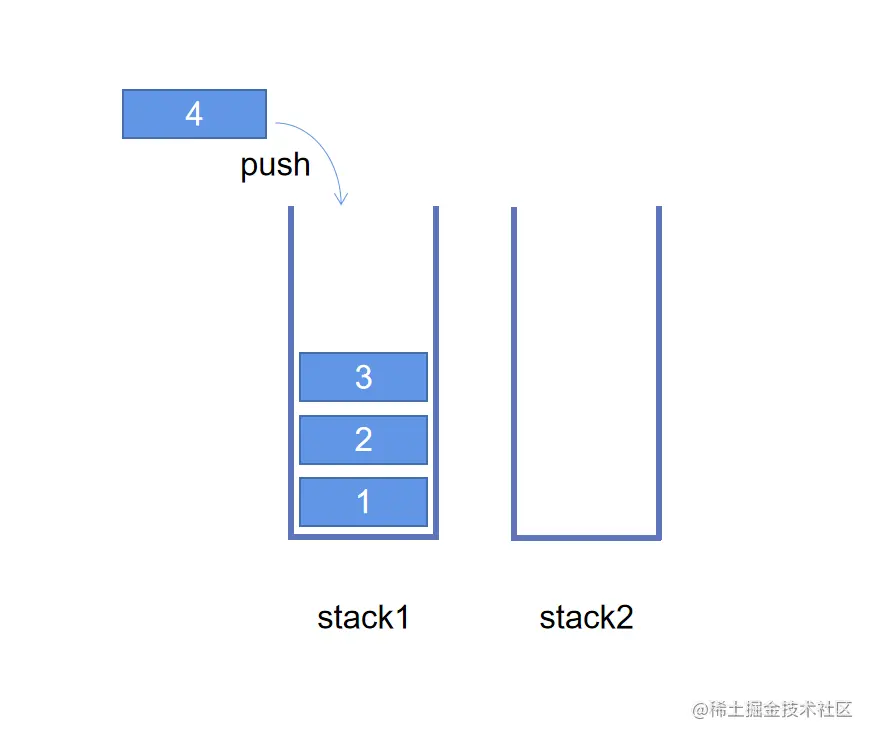 根据题目描述,队列要有push方法,堆栈本身就有push方法,所以可以直接套用,问题不大。而pop方法,堆栈是没有的,要实现pop方法,需要两个堆栈(stack1和stack2)。如下图所示,调用队列的push方法时,始终将元素push到stack1中: