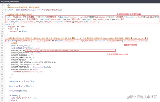 //判断如果产品为API研发管理 且 事件为API文档 且 操作为切换api状态 则 请求【第(一、4)步中拿到的企业微信机器人webhook地址】进行调用,填写到【 CURLOPT_URL 】中
