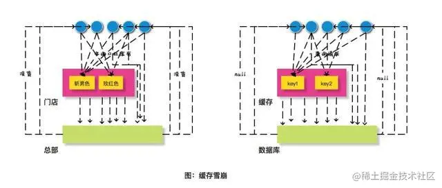 或者是门店突然出现问题了,不能提供服务了,很多顾客就可能自己打电话到总部咨询库存情况。类似这种情况,在缓存领域有一个类似的概念叫做缓存雪崩。