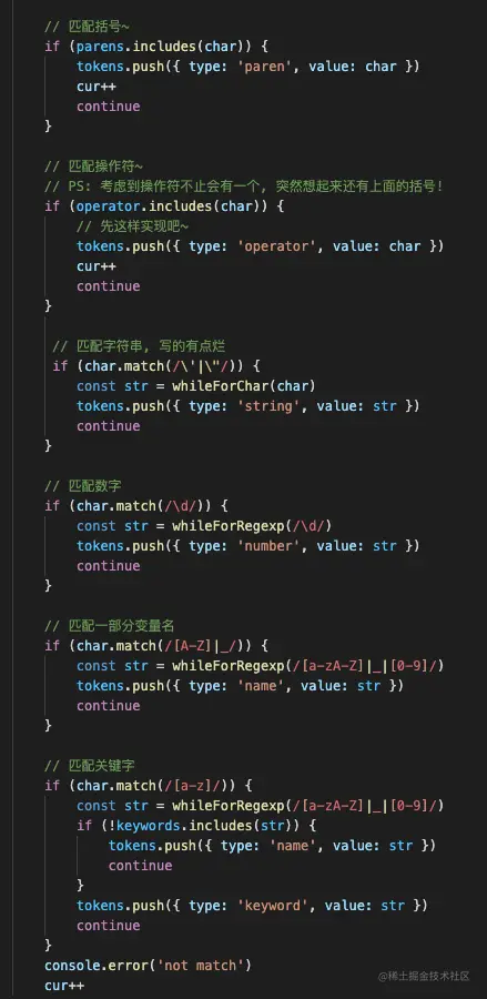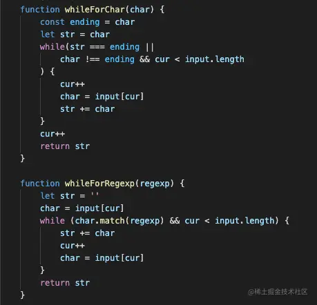 while (char.match(regexp) && cur < input.length) {