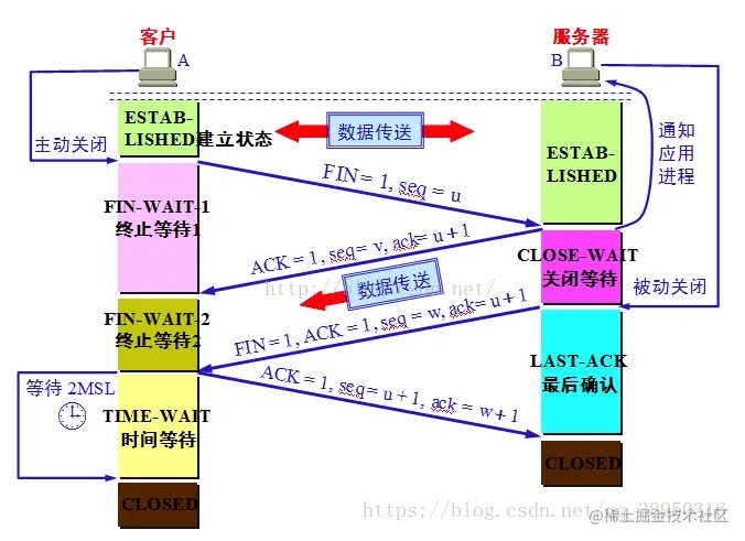 客户端进程发出连接释放报文,并且停止发送数据。释放数据报文首部,FIN=1,其序列号为seq=u(等于前面已经传送过来的数据的最后一个字节的序号加1),此时,客户端进入