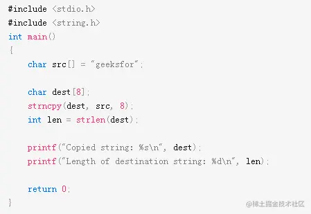 strncpy()的问题:如果src的前n个字符中没有空字符,则放置在dest中的字符串将不会以空字符结尾。因此,strncpy()不保证目标字符串将以NULL终止。未终止的strlen()字符串可能导致段错误。换句话说,C / C ++中的非终止字符串只是一个定时炸弹,正等待破坏代码。