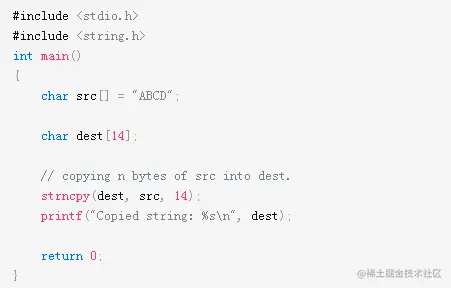 strncpy()函数类似于strcpy()函数,不同之处在于最多复制了src个n字节。如果src的前n个字符中没有NULL字符,则放置在dest中的字符串将不会以NULL终止。如果src的长度小于n,则strncpy()将另外的NULL字符写入dest以确保总共写入了n个字符。