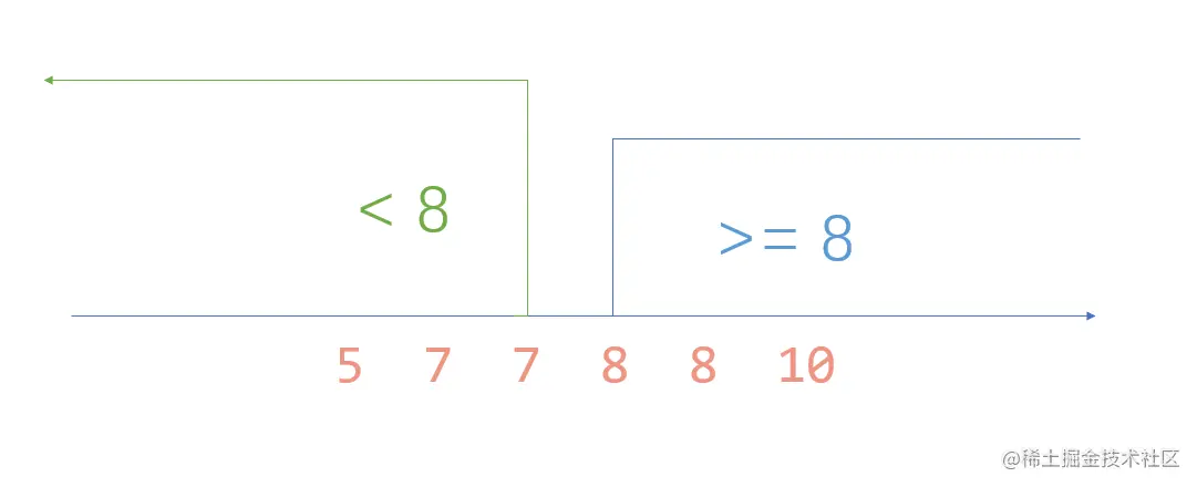 我们可以观察值为8的开始位置, 发现其特点: 处于该位置左边(不包含该位置)的所有元素都严格小于8. 处于该位置右边(包含该位置)的所有元素都大于等于8. 也就是说, 我们根据该位置, 将该数组划分成了俩个具有不同性质的区间. (为了方便, 后续将<8的区间称为左区间, >=8的区间称为右区间)