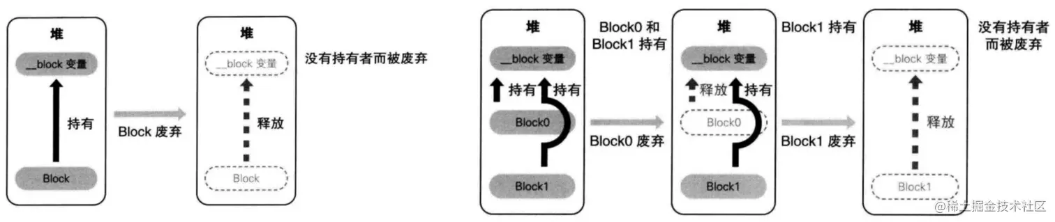__block变量从堆上移除,会调用__block变量内部的dispose函数,dispose函数内部会调用_Block_object_dispose函数,_Block_object_dispose函数会自动释放指向的对象(release)