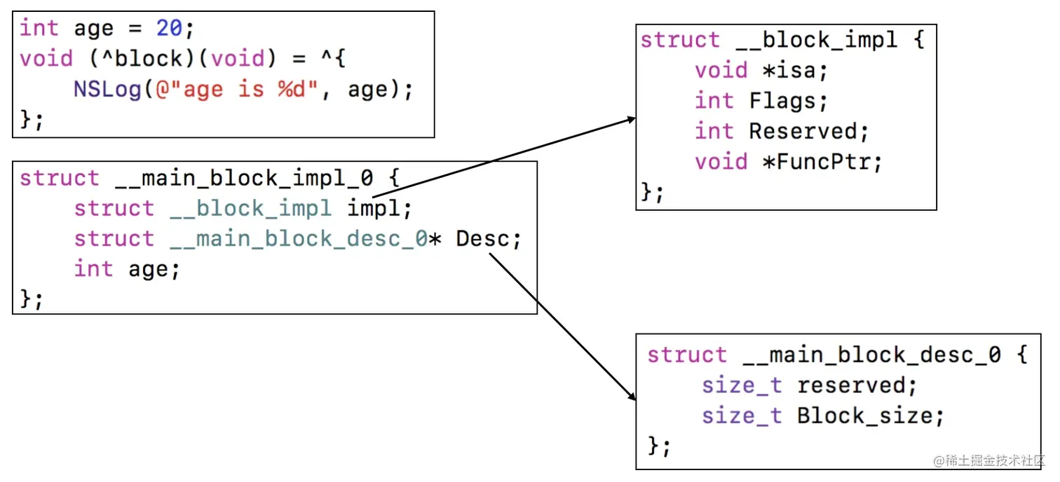 7.__main_block_impl_0的构造函数中 : age(_age)语法会自动将_age赋值给变量int age来保存。而且转换后的调用__main_block_impl_0可以直接转换为__block_impl类型,是因为两个类型的结构体地址是一样的,而且相当于直接把__block_impl里的值都放到__main_block_impl_0里