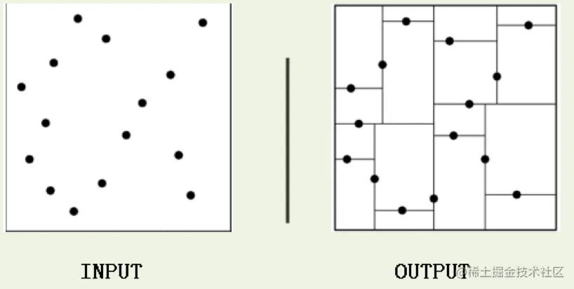 (2)通过递归的方法,不断地对k维空间进行切分,生成子结点。在超矩形区域上选择一个坐标轴和在此坐标轴上的一个切分点,确定一个超平面,这个超平面通过选定的切分点并垂直于选定的坐标轴,将当前超矩形区域切分为左右两个子区域(子结点);这时,实例被分到两个子区域。