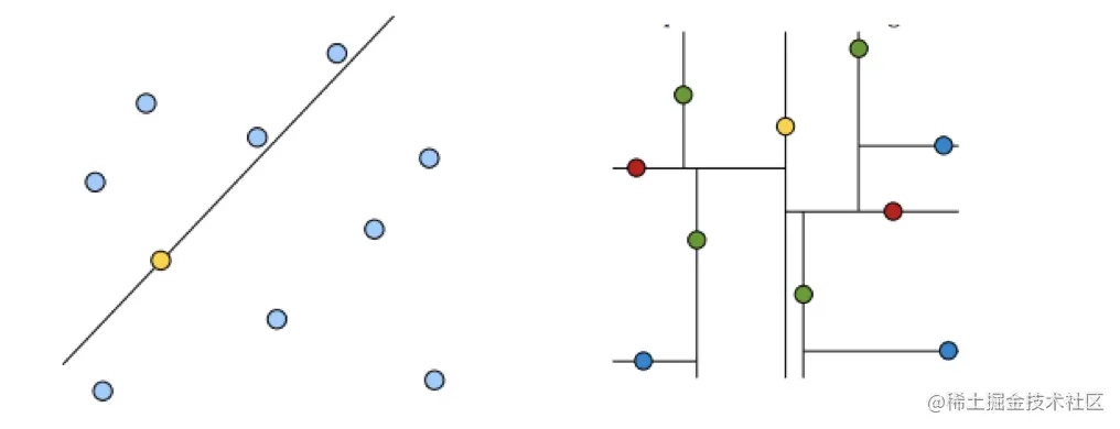 黄色的点作为根节点,上面的点归左子树,下面的点归右子树,接下来再不断地划分,分割的那条线叫做分割超平面(splitting hyperplane),在一维中是一个点,二维中是线,三维的是面。