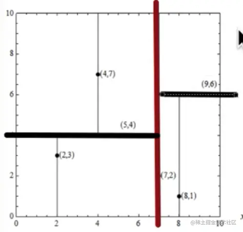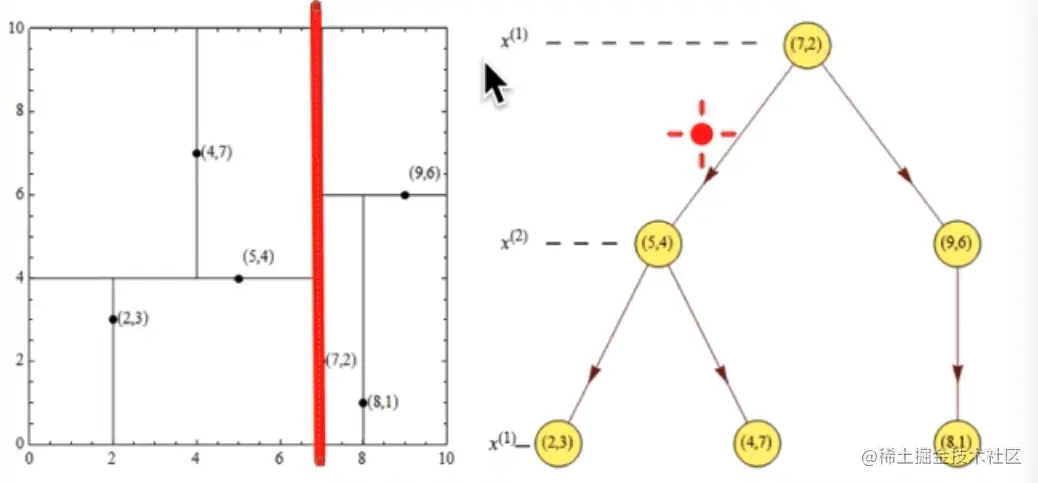 然后再回溯搜索路径,并判断搜索路径上的结点的其他子结点空间中是否可能有距离查询点更近的数据点,如果有可能,则需要跳到其他子结点空间中去搜索(将其他子结点加入到搜索路径)。