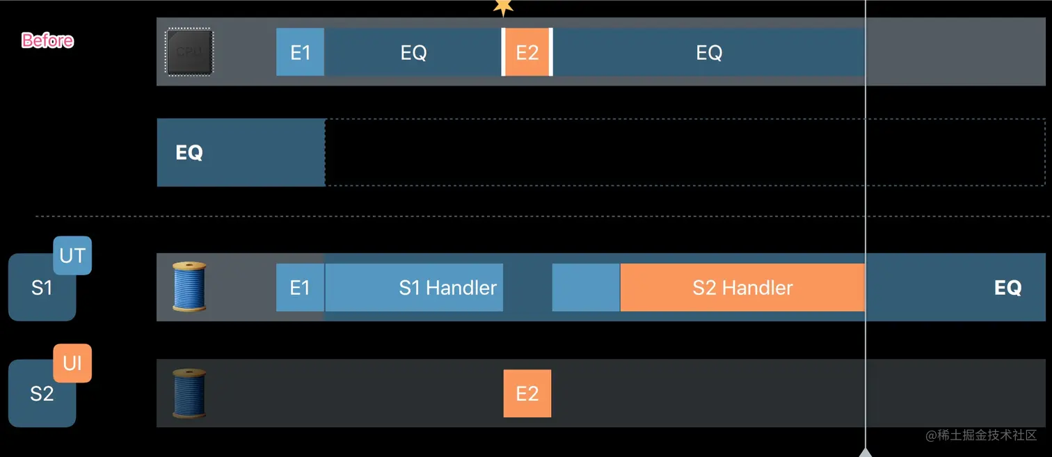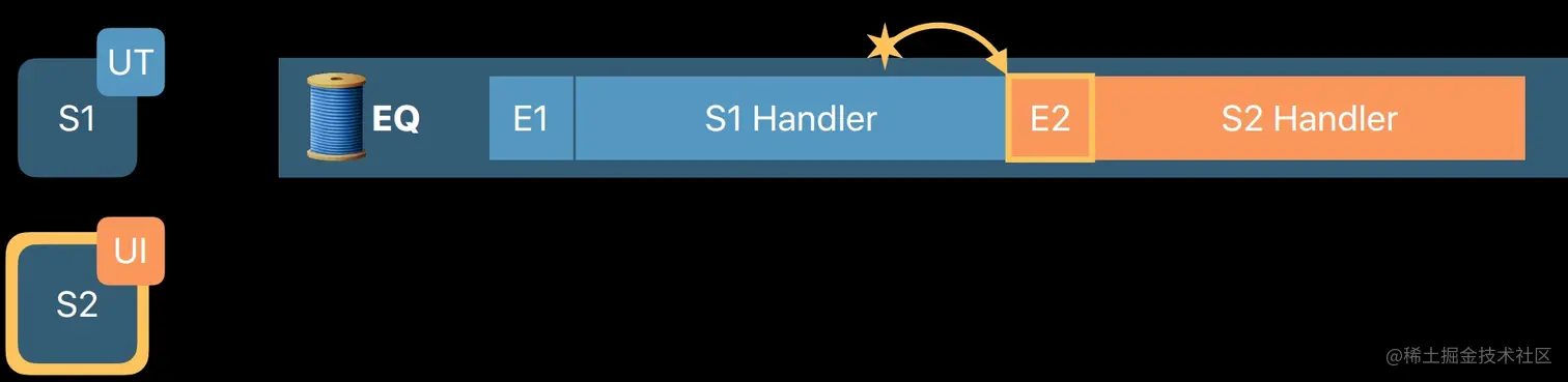 大致原理是当 S2 触发时,系统知道对应的队列正在执行,于是做了一个标记。