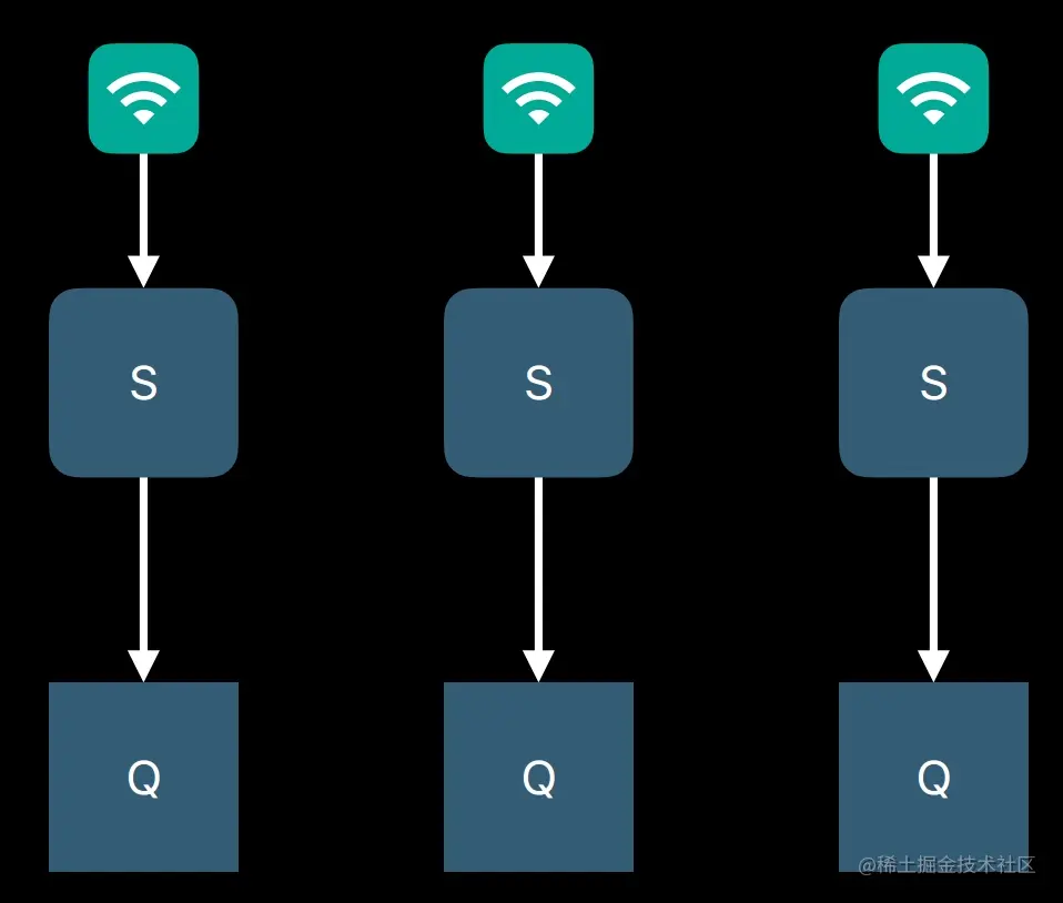 假如队列形式如下,S 表示网络发生变化, Q 表示网络变化时代码要执行的串行队列。