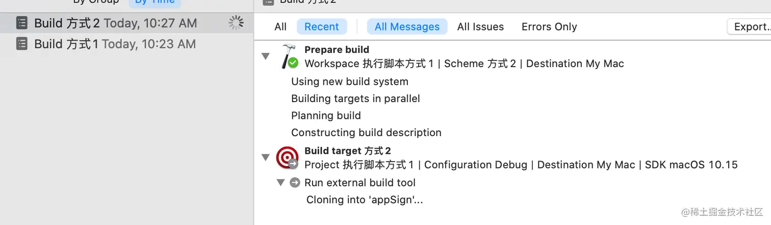 并且配置在run script的脚本的输出都是在xcode的编译界面,很不直观,而在config里面我们可以指定自己的终端输出,更直观