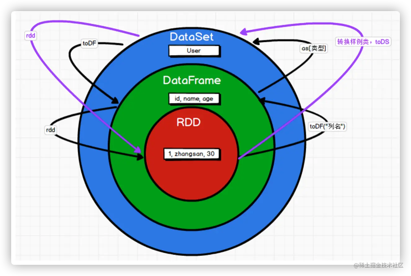 - 与RDD和Dataset不同,DataFrame每一行的类型固定为Row,每一列的值没法直接访问,只有通过解析才能获取各个字段的值