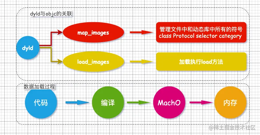 dyld与libobjc的如何关联调用,本篇目的理解类的相关信息,比如方法,属性,分类等信息是如何加载到内存的,重点是map_images和load_images函数。