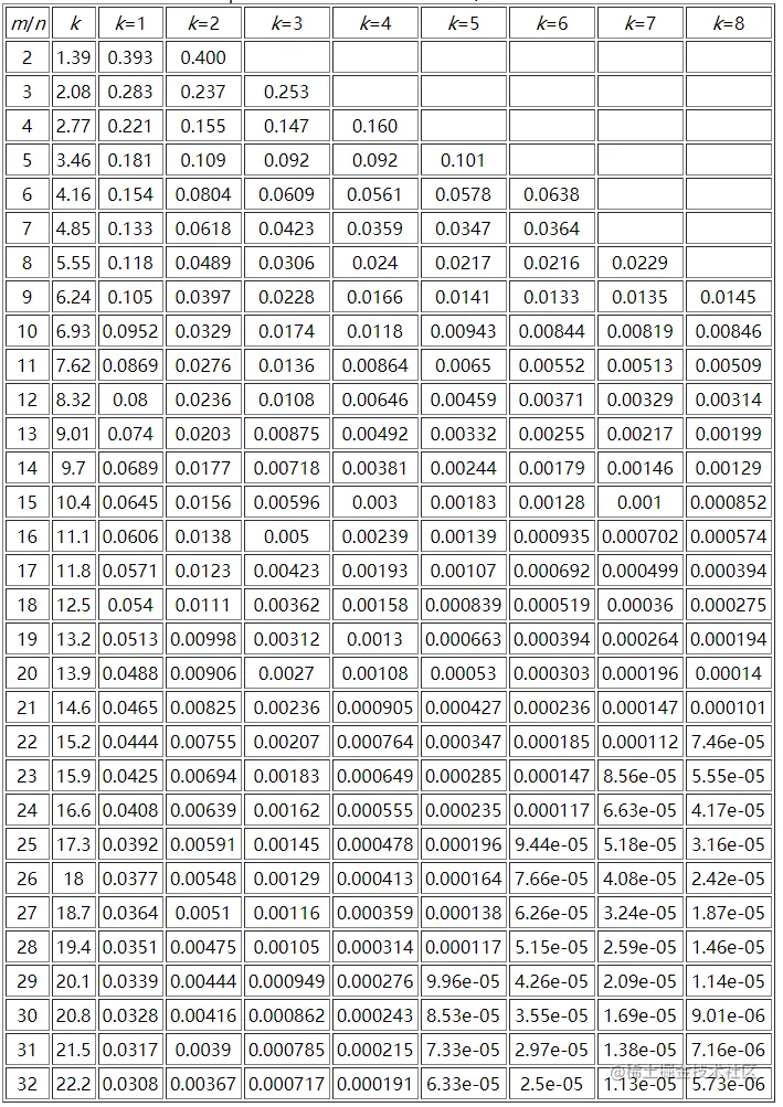 这里可以推算一下表格中最大参数所需要的空间极限,假设n为10亿,m/n = 32,那么m为320亿,而k为24,此时的误判率为2.17e-07(0.000000217),需要空间3814.69727m。一般规律是: