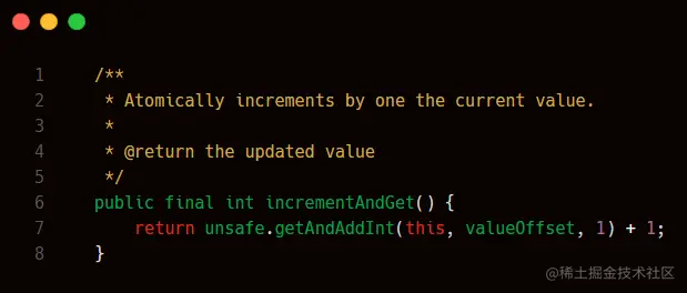 可以看到这个incrementAndGet里,使用了一个unsafe类,unsafe里提供了一个getAndAddInt方法,我们进一步看下其源码