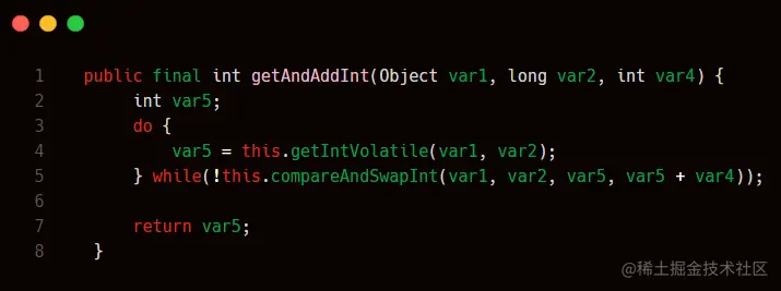 compareAndSwapInt是一个native标注的方法,这个代表是底层的代码。 所以我们回头看getAndAddInt的实现,当执行compareAndSwapInt失败的时候是一直执行,直到成功为止。
