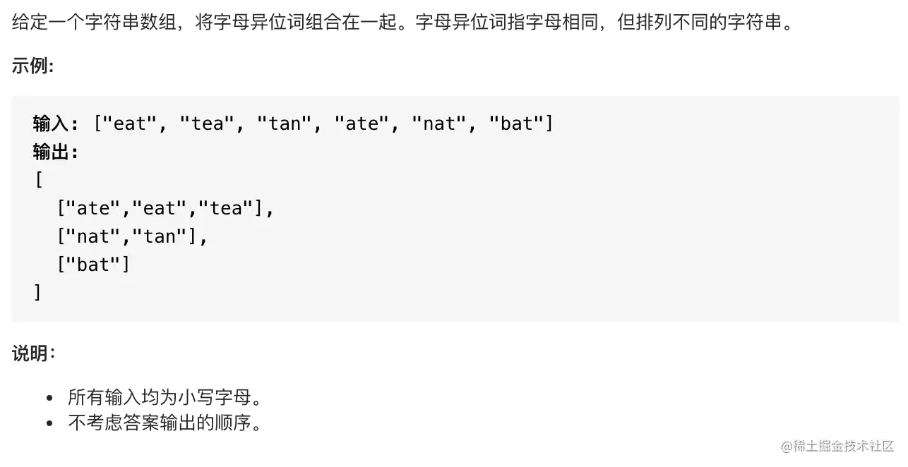 题解: 1.写这个题的时候我准备用hashMap的做法,核心思想就是循环每个值排序,因为如果是字母异位词排序完再转换成string值一定是一样的,就是代码中的key是一样的。比如:abc和acb是异位词,但是abc和acb排完序都是是abc,核心思想。