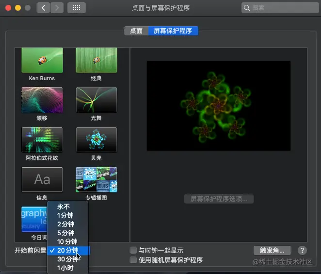 4.更改左下角时间,开始前闲置时间,这样苹果电脑屏保时间就设置好了